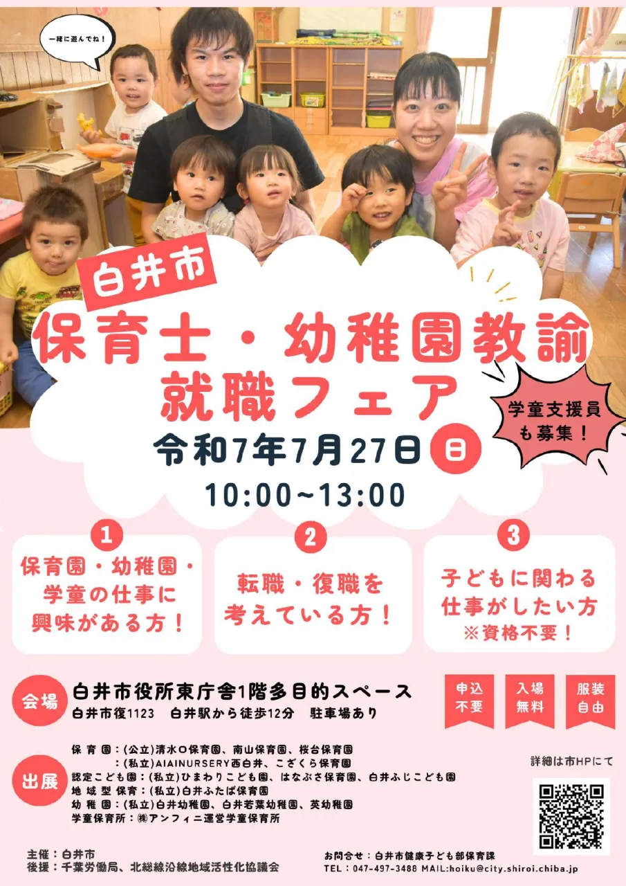 | イベント詳細 | 令和7年度白井市保育士・幼稚園教諭就職フェア 詳細▶ |