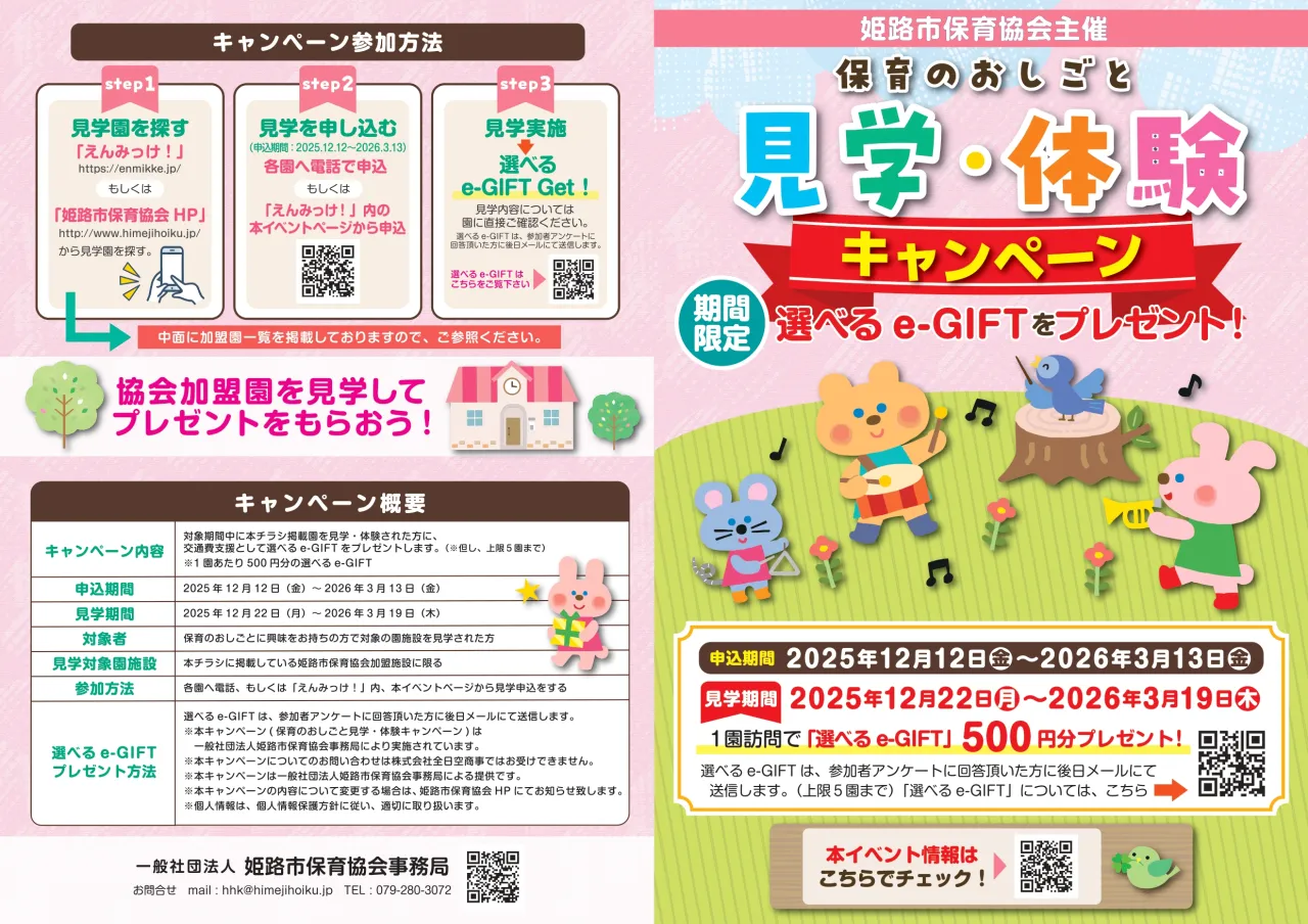 | 参加条件 | 対象者:保育のおしごとに興味をお持ちの方で対象の園施設を見学・体験された方 見学対象園施設:参加園一覧掲載園・チラシ掲載園施設に限る 参加方法:各園へ電話、もしくはWEB(えんみっけ!サイト)から見学申込みをする 選べるe-GIFTプレゼント:参加者アンケートに回答頂いた方に後日メールにて送信します(※但し、上限5園まで) |